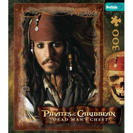 This 300 piece jigsaw puzzle features an image from Disney's movie Pirates of the Caribbean Dead Man's Chest portraying the infamous Captain Jack Sparrow. This puzzle's excellent craftsmanship, top-quality paper and thick premium board allow the pieces to snap firmly into place. The puzzle measures 15 x 21.25. Ages 7 and up.
